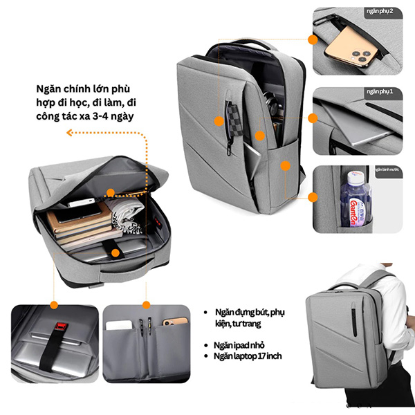 + Nhiều ngăn phụ nhỏ khác nhau dùng để chứa các vật dụng nhỏ gọn như điện thoại, Ipad, giấy tờ, hộ chiếu, bút, thước, chìa khóa, thẻ nhà. Ngăn nhỏ bí mật giúp để chứa ví tiền cũng như tài sản cá khác như ví tiền, trang sức, 2 bên có ngăn nhỏ đựng bình nước, ô dù.