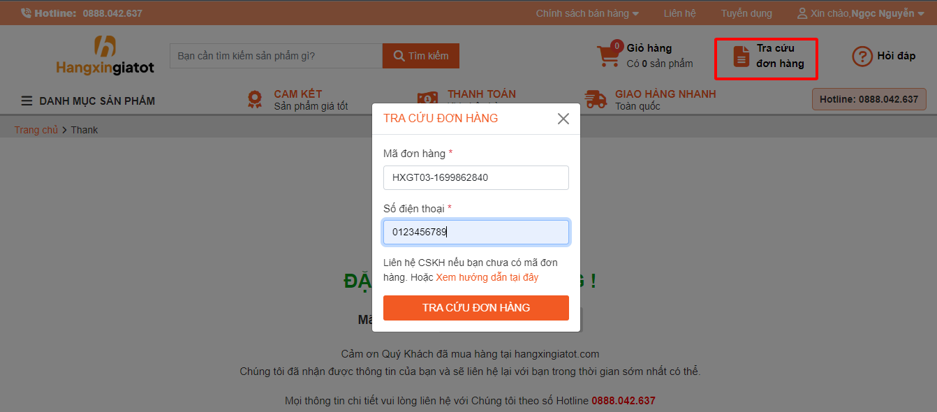 * Với những khách hàng chưa đăng ký/đăng nhập tài khoản trên Hangxingiatot.com, Quý khách điền thông tin Mã đặt hàng và Số điện thoại vào Box Tra cứu đơn hàng (Xem hình dưới đây)