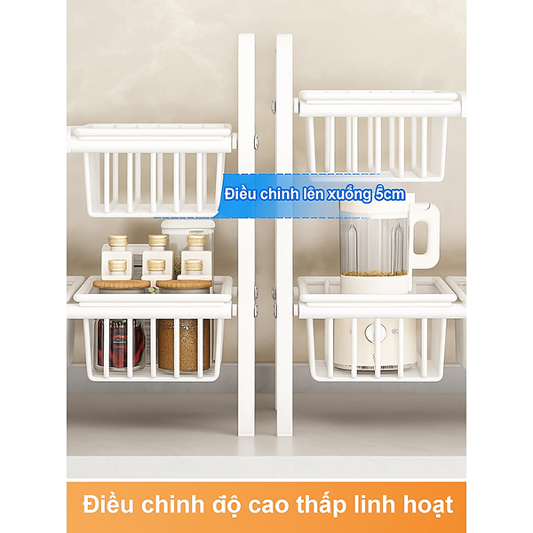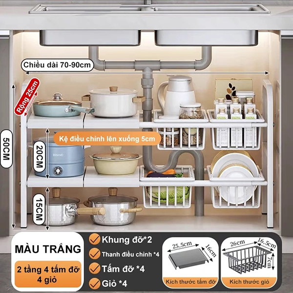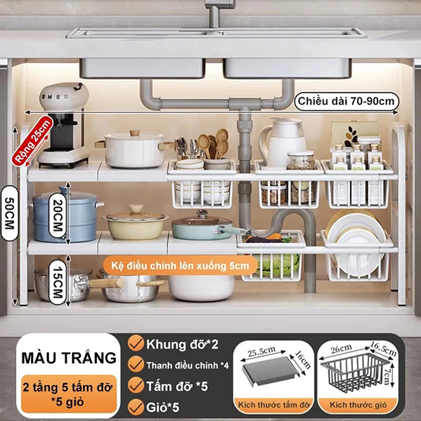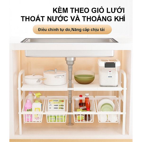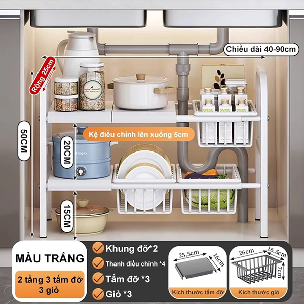 Sản phẩm: Kệ để đồ gầm bếp bồn rửa đa năng thép không gỉ có thể điều chỉnh kích thước tiện lợi, Kệ 2 tầng (3 bảng)+ 3 giỏ