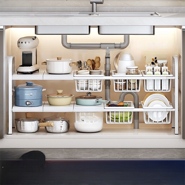 - Kệ xếp để dưới bồn rửa chén hay gầm bếp, trong nhà bếp hay phòng tắm để các vật dụng, đồ dùng: ly tách, xoong nồi, mỹ phẩm…một cách gọn gàng, ngăn nắp giúp không gian nhà bạn thoáng đãng, sạch sẽ..